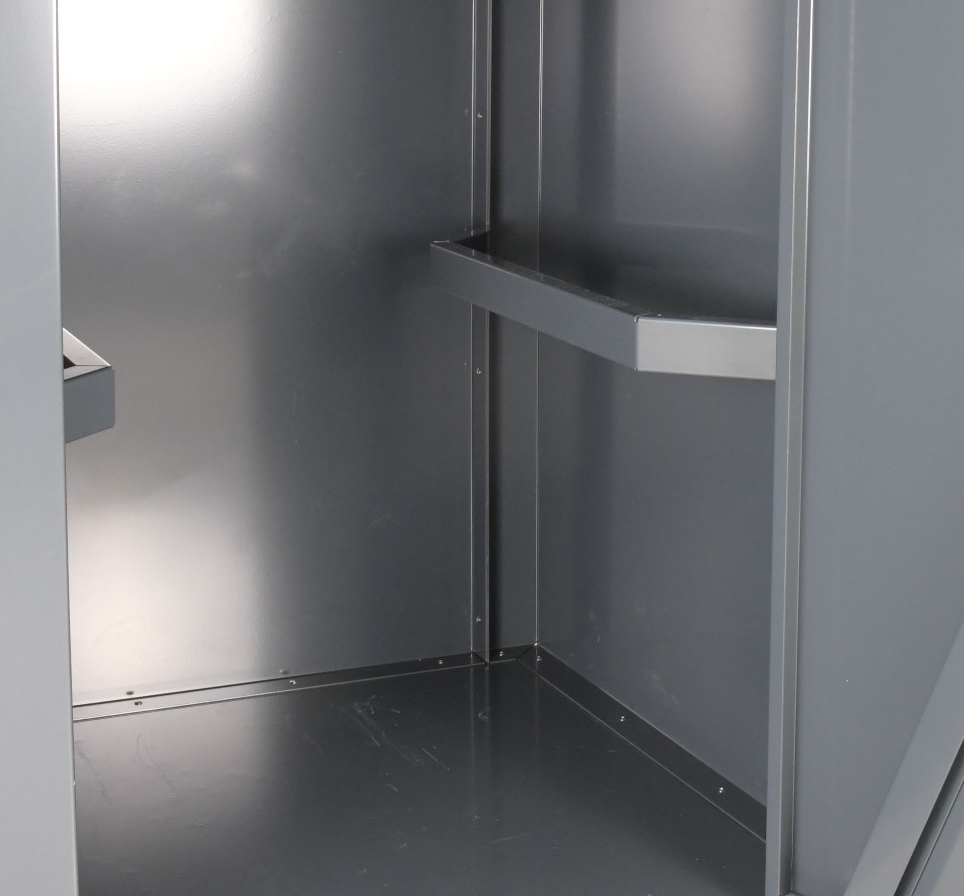 Le bac de collecte est accessible par une porte s'ouvrant sur l'avant de l'abri-bac ou une porte sur l'arrière. Cette porte est sécurisée pour empêcher l'accès aux personnes non-autorisées.